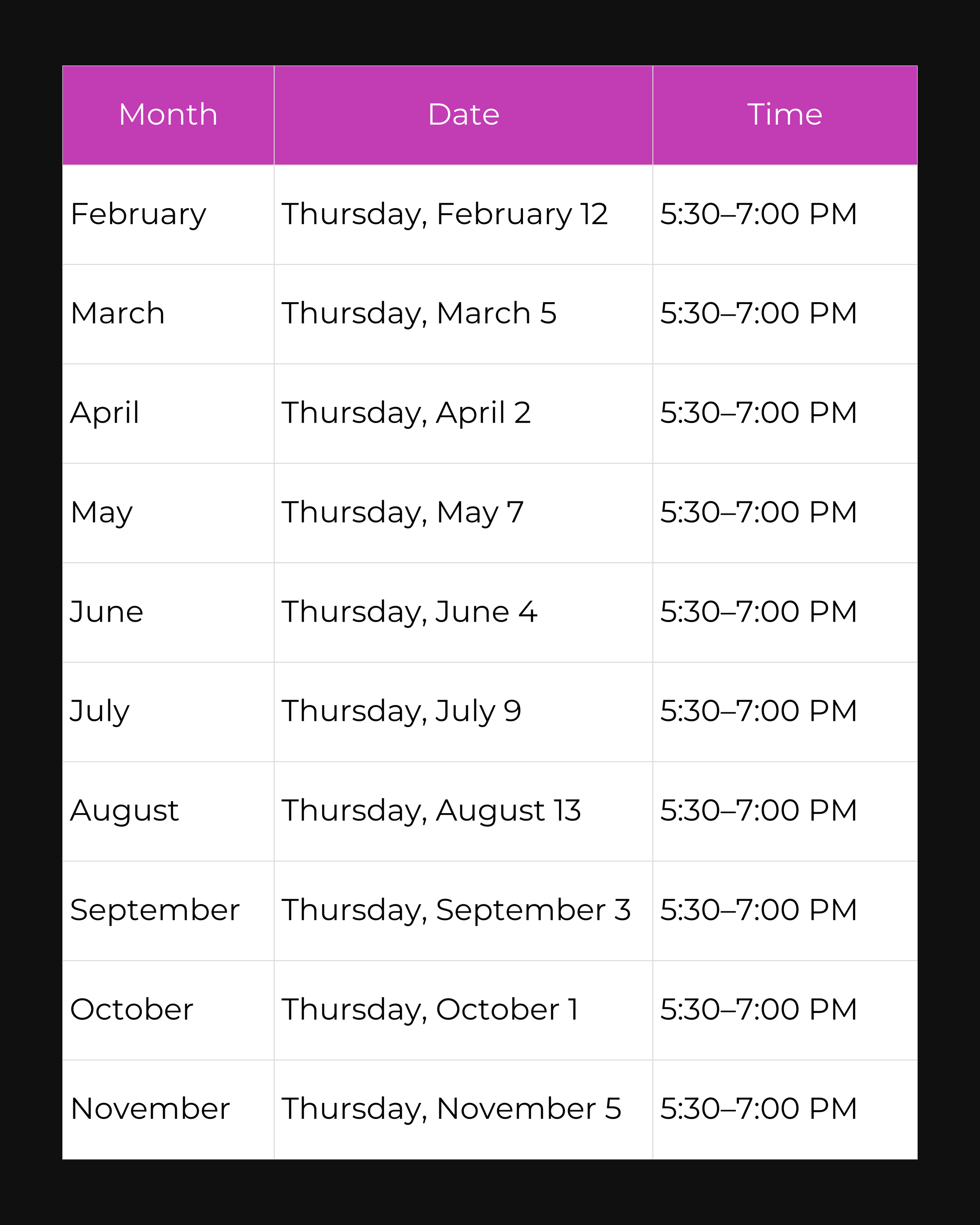 Monthly | Thursday Evenings | 5:30 PM